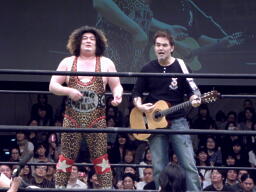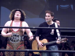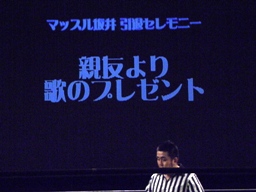 続いてマッスル坂井引退セレモニー、親友より歌のプレゼント(左写真)。