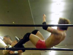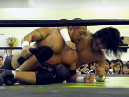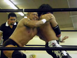 東郷レッグロック(右写真)、佐々木は十字固めに切り返す、東郷またレッグロックに返す、うつぶせの佐々木にフェースロック、佐々木切り返してがぶる。