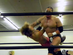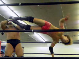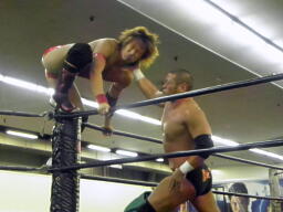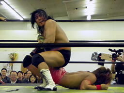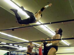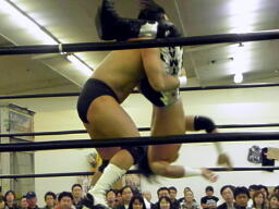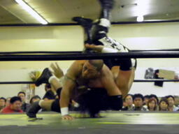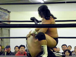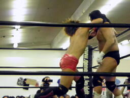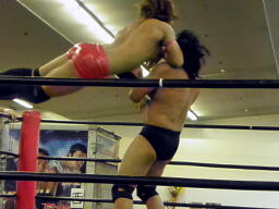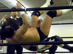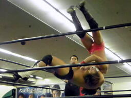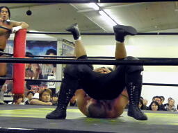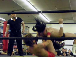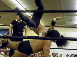 東郷ペディグリーの体勢に行くが佐々木はブロックしてジャックナイフ(左写真)、カウント2。佐々木延髄蹴り、高尾にタッチ。