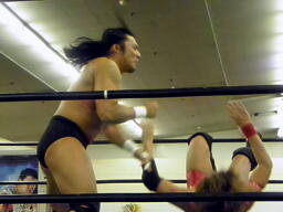 GENTAROロープに振ってバックエルボー(左写真)、ボディスラムからカバー繰り返す、高尾は3回とも2で返す。GENTAROストンピング。
