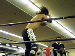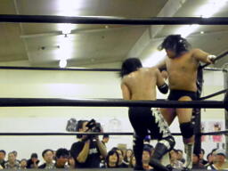 GENTAROコーナーに振って突っ込む、高尾かわしてドロップキック、高尾エルボー連打(右写真)。