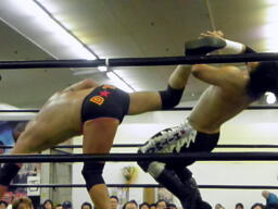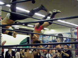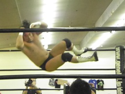 GENTAROボディスラム、コーナーに上ってダイビングエルボードロップ(左写真)、カウント3。