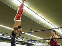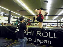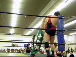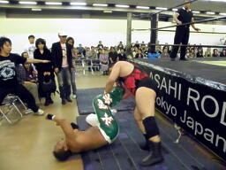 アントンチョップ返す、斗猛矢キャッチしてロープ渡り(右写真)からホイップ。アントン場外転落。