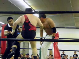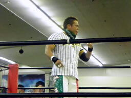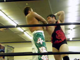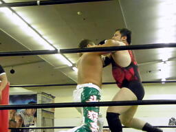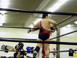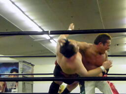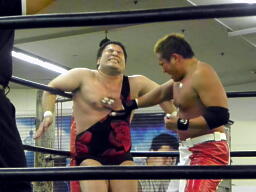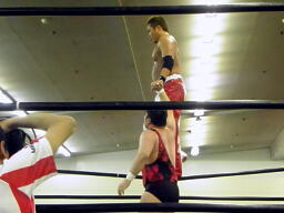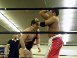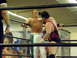 斗猛矢腕を固める(右写真)、アントン「ヘア!」とアピール。斗猛矢ホイップ、ヘッドロック、アントンロープに振る、斗猛矢ショルダーブロック。