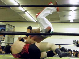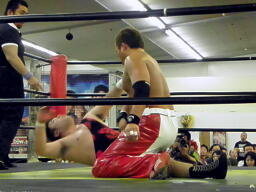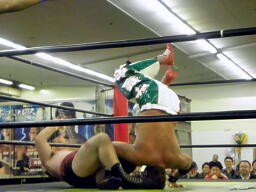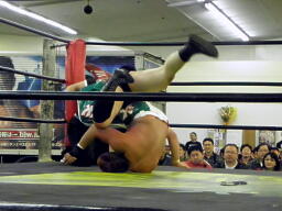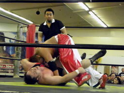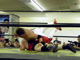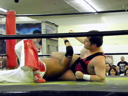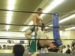 斗猛矢対角線コーナーに振って突っ込む、アントンかわしてスクールボーイ、カウント2(右写真)。