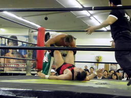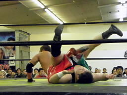 斗猛矢ダブルアームの体勢、アントンブロックして首固め(右写真)、カウント2。