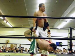 斗猛矢首投げからボディシザーズ(左写真)。