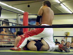 斗猛矢カニばさみで倒すと背中の上で回転(左写真)、エルボードロップ、アントンはカバーをカウント入る前に返す。斗猛矢「今の3入っただろ?」松井「1つも入ってません。」5分経過。