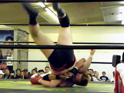 引っくり返してフォール(右写真)、カウント2。