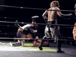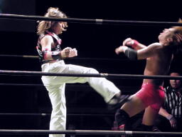 星誕期ブレーンバスター、MIKAMI背後に着地するとロープに押し込む、鳥羽がエプロンからハイキック(右写真)。