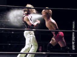 試合が開始してもなかなか凛音が正面向かないなあ、と思ったら接近してきた高尾にシャンパンミスト(右写真)。うーん、どんな手を使ってでも、という姿勢はいいが・・・。