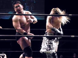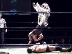 ストンピングからその場跳びムーンサルトプレス(左写真)、カウント2。鳥羽にタッチ。