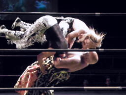 凛音ロープに振る、高尾ロープに飛び乗って反転フライングエルボー(左写真)。