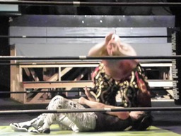 MIKAMI高木をドロップキックで場外に落とすとトルニージョ(左写真)。