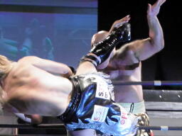 高木は「キムチ!」と叫びながらチョップ、鳥羽は「チヂミ!」とローキックで返しボディにソバット(右写真)