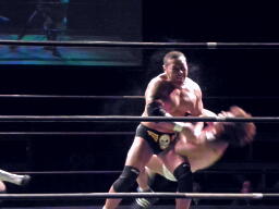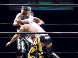 GENTARO一本背負いでブレーク、腕固める、佐々木切り返すがGENTAROはアームホイップ(右写真)、東郷にタッチ。