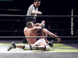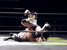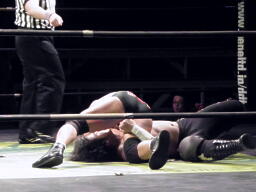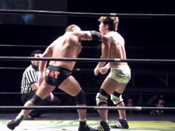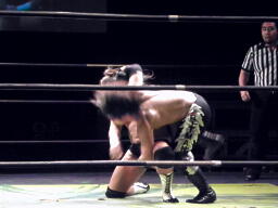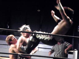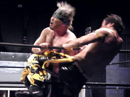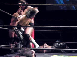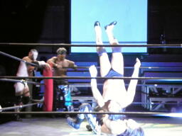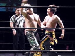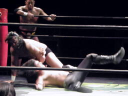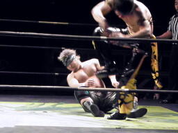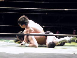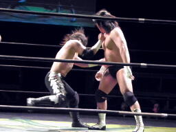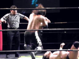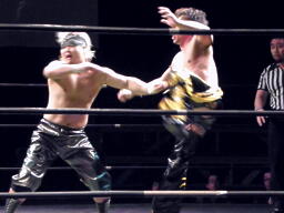 GENTARO切り返してヘッドロック(右写真)、KUDOはコーナーに押し込んで佐々木にタッチ。