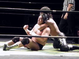 手四つから腕の取り合い、東郷ハンマーロック(左写真)からメキシカンストレッチ、そしてエビ固め、カウント2。