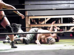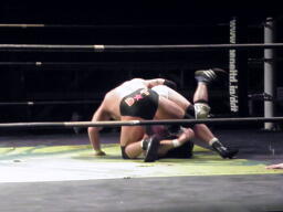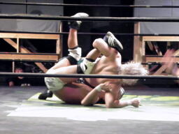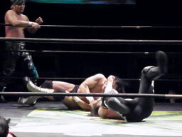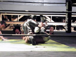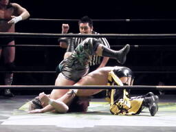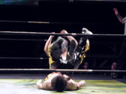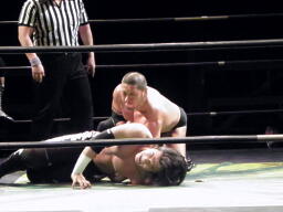 GENTAROロープに振る、佐々木ブロックしてエビ固め(右写真)、カウント2。