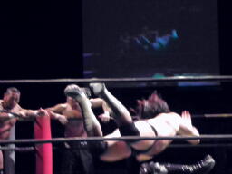 東郷佐藤をコーナーに詰めて逆水平(左写真)、ナックル、また逆水平、ウラノにタッチ。佐藤ウラノをコーナーに押し込んでKUDOにタッチ。
