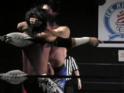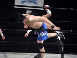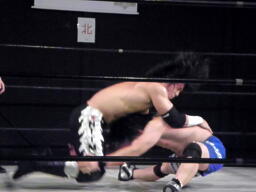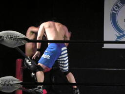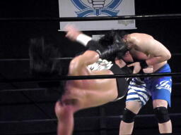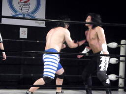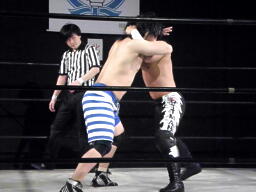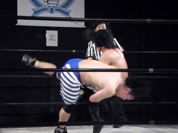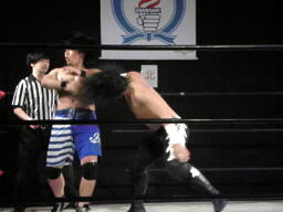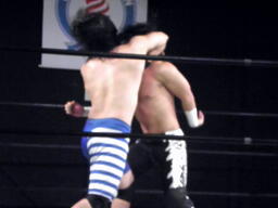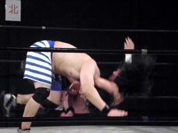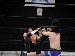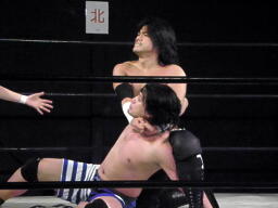 佐々木スナップスープレックス(左写真)、カウント2。カバー3回繰り返す、彰人いずれも2で返す。5分経過。