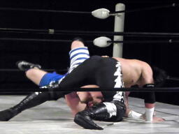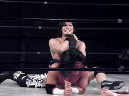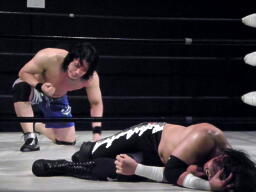 佐々木切り返してフライングメイヤーからグラウンドヘッドロック、彰人エビ固めに(右写真)、カウント1。彰人ヘッドシザーズでブレーク。