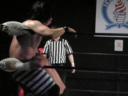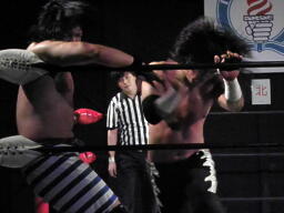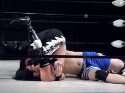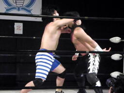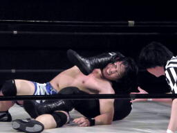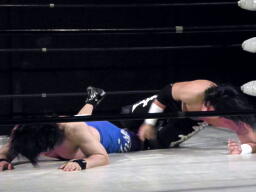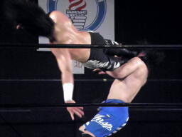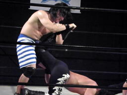彰人は佐々木をコーナーに振って突っ込む、佐々木かわしてコーナーに乗り上げた形の彰人を肩に担ぐとNOW OR NEVERから片エビ固め(左写真)、カウント3。