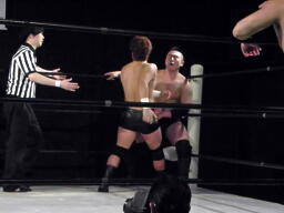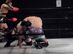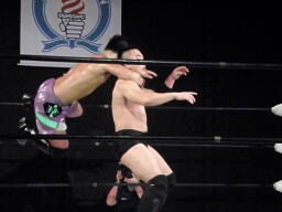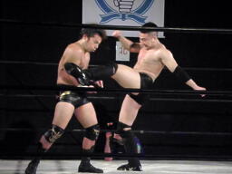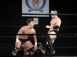 翔太コーナーに詰めてチョップ連打(右写真)、妻木もチョップ打ち返しボディスラム、関根にタッチ。