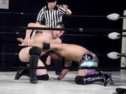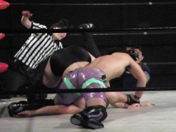 安部前かがみの妻木に回転エビ固め、そこから一旦引き起こして腕を固定してのエビ固めに(左写真)、カウント3。