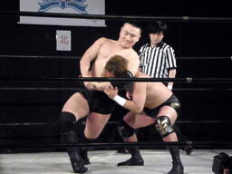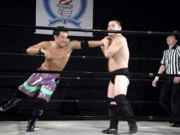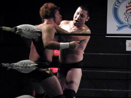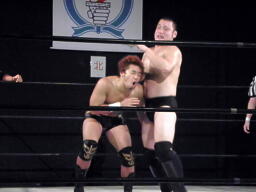 ロックアップ、妻木ヘッドロック(右写真)、翔太ロープに振る、妻木ショルダーブロック。