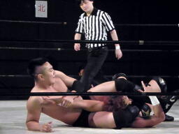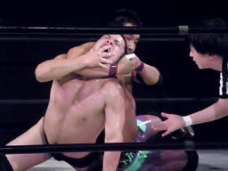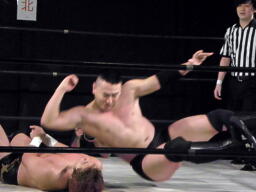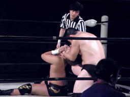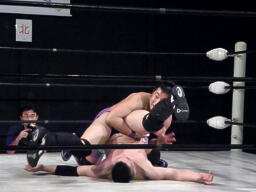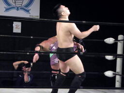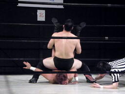 関根ボディスラムからサッカーボールキック、逆片エビ固め(右写真)、翔太ロープ。5分経過。