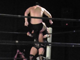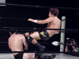 安部まずコーナーの妻木にドロップキック。関根が捕まえてロープに振るが切り返してフライングエルボー(右写真)。