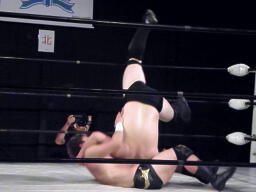 妻木もボディスラムからエルボードロップ(左写真)、カウント2。