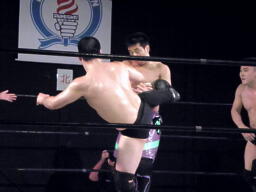 妻木立ち上がるとロープに飛ぶ、安部カウンターのトラースキック(右写真)からドロップキック、カバーは関根がカット。