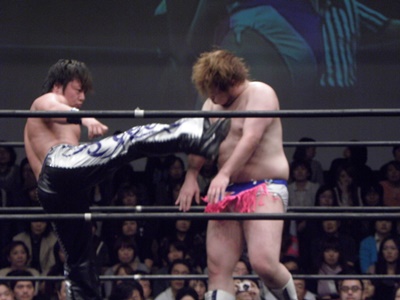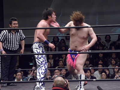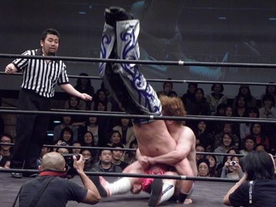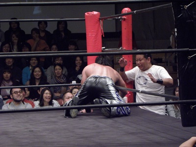 もうディーノは尻餅状態のまま。そこにHARASHIMA蒼魔刀(右写真)、カウント3。