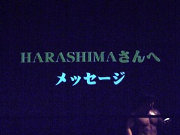 スクリーンには「HARASHIMAさんへメッセージ」の文字(左写真)。ディーノの声が流れる。
