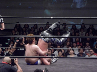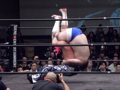 そしてマージャンスープレックス(左写真)、ディーノは尻を強打。