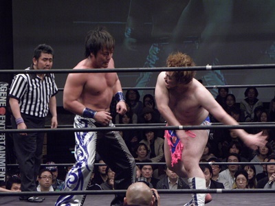 ディーノ男色デストロイヤー狙う、しかしHARASHIMAブロックしてアックスギロチンドライバー風に落とす(左写真)。ダブルノックダウン。