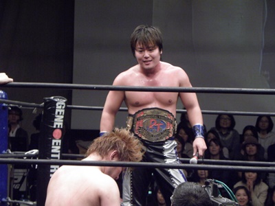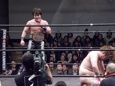 「今こうやって後楽園ホールでDDTのメインイベントを2人で闘うことができて」(左写真)