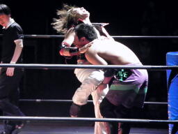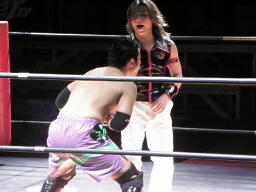 凛音コーナーに振ってミドルキック、安部かわして逆に突っ込む、凛音カニばさみで倒す(左写真)。