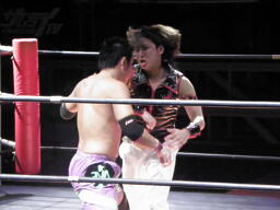 凛音がガットショットで先制(右写真)、エルボー打ち込む。