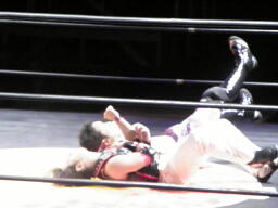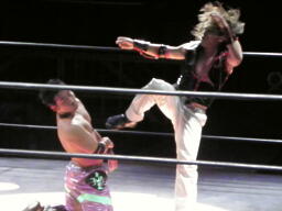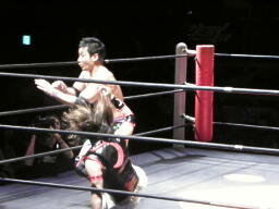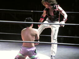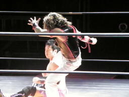 コーナーに上ってミサイルキック(右写真)、カウント2。