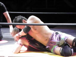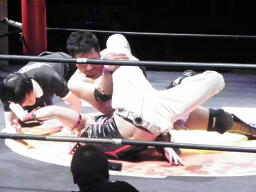 安部ロープに振る、凛音ブロックしてヒザ蹴り、回転エビ固めに(右写真)。
