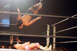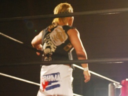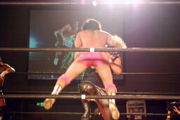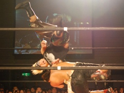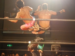 ブレーンバスターのような形でトップロープに引っ掛けると背中にドロップキック(右写真)、カバーはKUDOがカット。ウラノはGENTAROにタッチ。