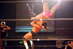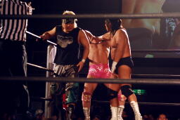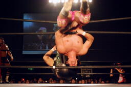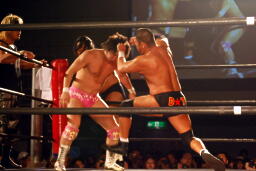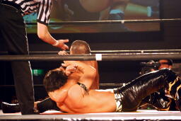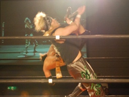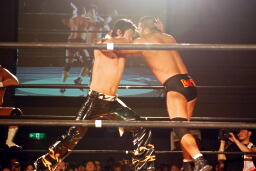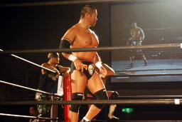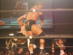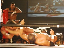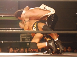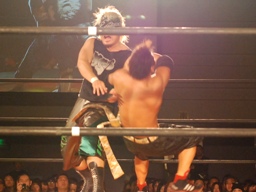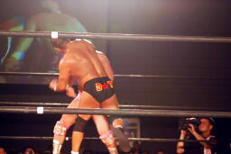 GENTARO張り手、ブレーンバスター(右写真)、カウント2。東郷にタッチ。5分経過。