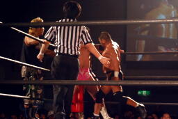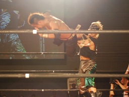 KUDOが出てきてロックアップ(右写真)、東郷ロープに押し込む、ブレーク。