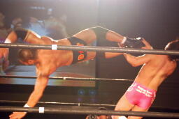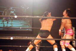 東郷フライングメイヤー(左写真)、KUDOヘッドシザーズでブレーク。東郷アームホイップからアームロック、KUDO切り返す、東郷さらに切り返す、KUDO下から蹴ってブレーク。ウラノにタッチ。KUDOも内田にタッチ。