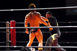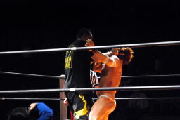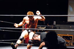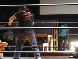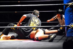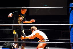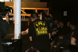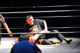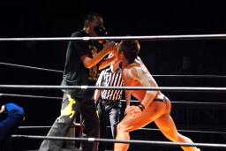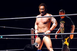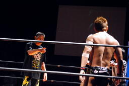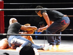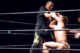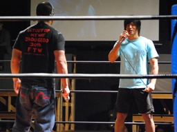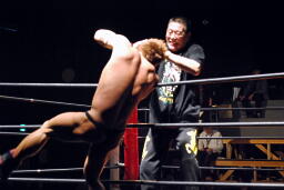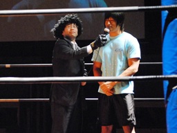 鶴見GMがリングイン、場を仲裁する(右写真)。ケニーも12月末に来日するということで12月26日後楽園ホール大会でのタイトルマッチを提案。邪道・外道は了承。
