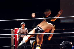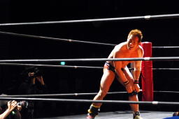 小鹿がロープに押し込む(右写真)、マイケルは場外エスケープ。小鹿が焦れて追いかけるとマイケルはリングに戻る。