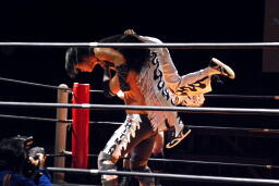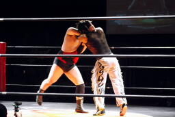 MIKAMIキャッチ延髄、アントンかわすがMIKAMIはバックキック(左写真)。